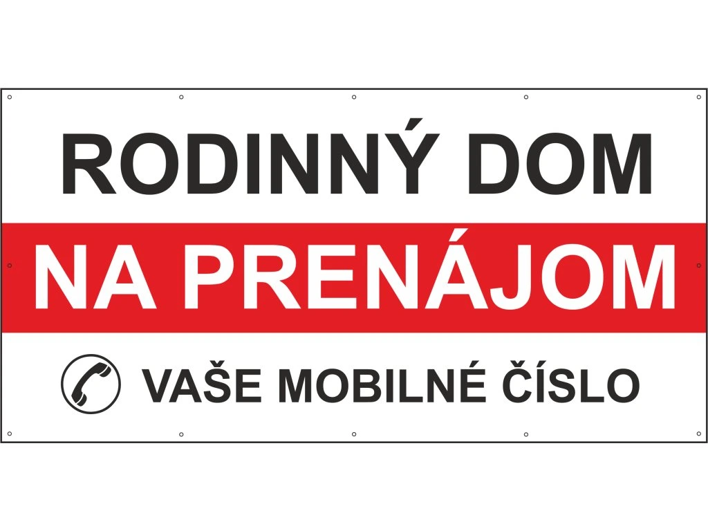 Chcete prenajať svoj rodinný dom a nechcete oslovovať realitnú kanceláriu? Vyrobíme Vám reklamný baner s očkami, ktorý si možete jednoducho namontovať na svoj plot domu. Stačí keď nám do poznámky napíšete Vaše telefónne číslo.