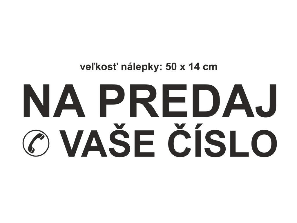 DO POZNÁMKY NAPÍŠTE SVOJE TELEFÓNNE ČÍSLO. Plotrovaná nálepka s prenosovou fóliou na ľahkú aplikáciu na Vaše auto s názvom NA PREDAJ + VAŠE MOBILNÉ ČÍSLO. Rozmer nálepky: 50 x 14 cm.