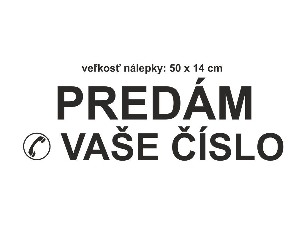 DO POZNÁMKY NAPÍŠTE SVOJE TELEFÓNNE ČÍSLO. Plotrovaná nálepka s prenosovou fóliou na ľahkú aplikáciu na Vaše auto s názvom NA PREDAJ + VAŠE MOBILNÉ ČÍSLO. Rozmer nálepky: 50 x 14 cm.